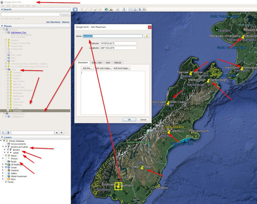 In Google Earth I turned on borders and turned off roads, then put a placemark in the different regions with a title . I made a new folder to store all the placemarks in. I wanted to get that data to use in sheets, a Lat/Long & Title. I knew I could go into individual placemarks and cut/paste data but I was sure there is an easier way to export multiple points from Google Earth.
