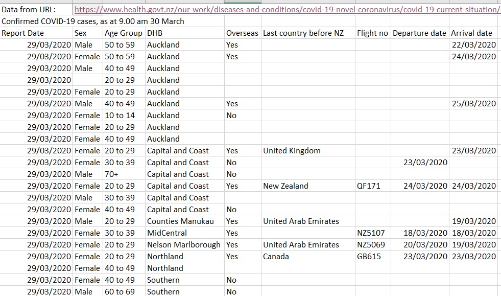 I’m pulling the data into Excel with its Data>from Web tool. The MoH data comes in with the tables. I’m also pulling population data of DHB’s from wiki, and that pulls in the whole page.