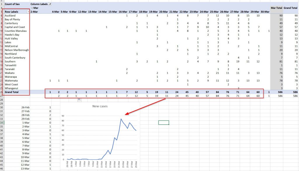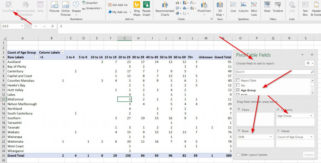 After pulling in the data into a table (not an Excel Table format, just rows/columns) I selected all the table and created a pivot table. Pivot tables are still a mystery for me but it collates things beutifully. I was trying to get a list of all the DHB’s and was trying to filter the original table into giving unique instances, when Pivot table elegantly puashes this data out.