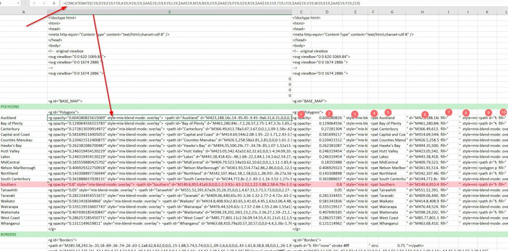 I’ve now built the whole map, Regions, Borders, Labels, Dots & lakes (a feature) into Excel so that I can easily chage colours and features.