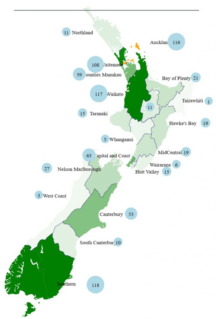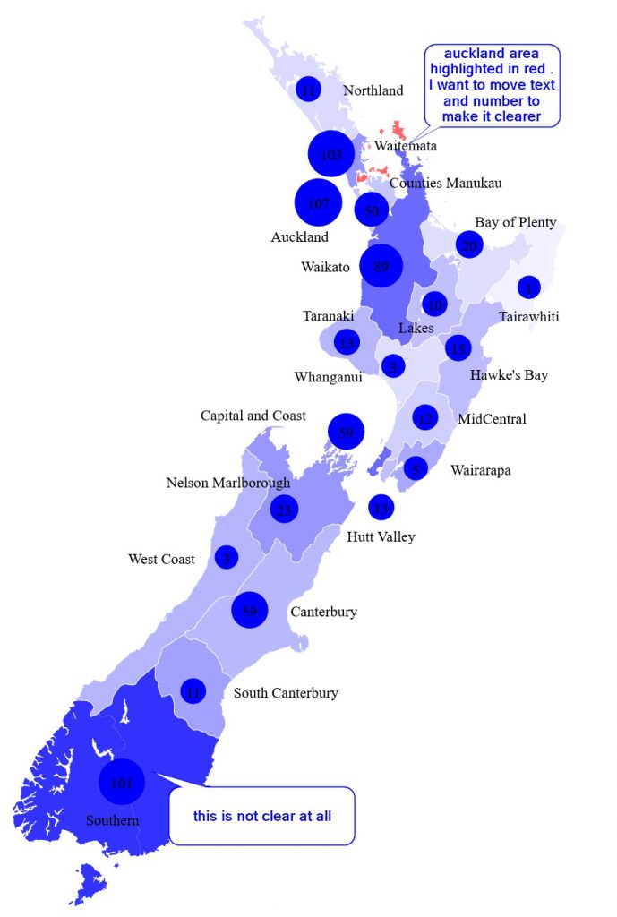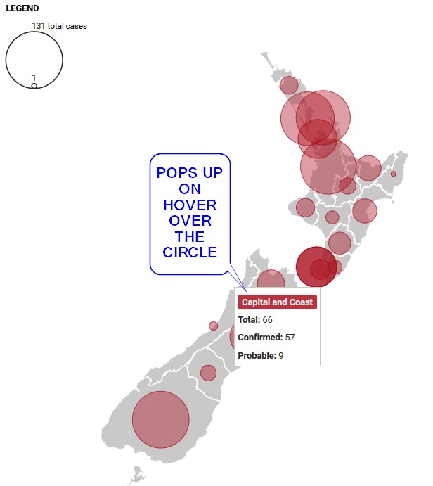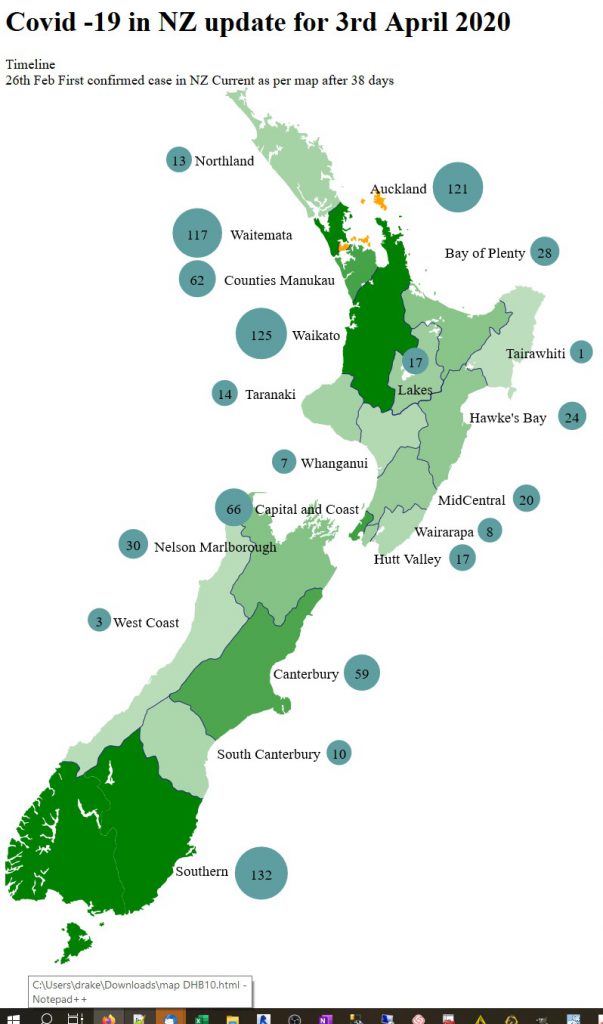 The Ministry of Health(MoH) have posted the original dataset on a different web page of each case and which District Health Board (DHB) they are under. The data can be found here. Instead of by region, its mapped to the District Health Board Regions. So the original map I was using in this post is not of any use. I have looked to see if I can get DHB boundaries, but so far have only found tiles or images, so no HTML <path> data.
