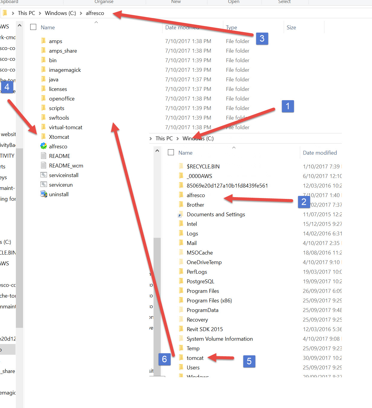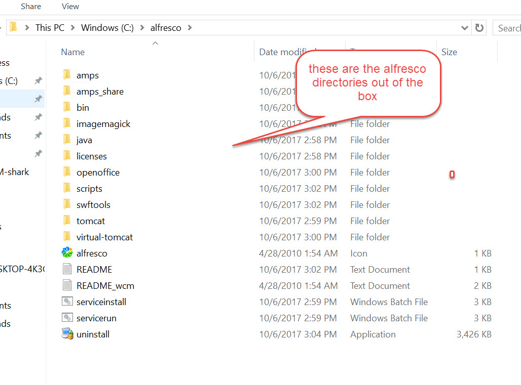 The alfresco setup on install looks like this. You see that there is a tomcat directory inside the alfresco directory.