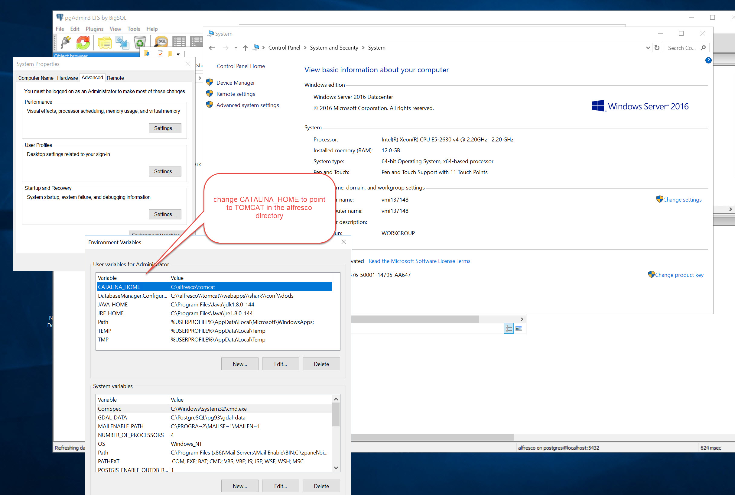 2. Repoint CATALINA_HOME to C:\alfresco\tomcat instance (and also database.manager.configuration (one below- ((for SHARK)))