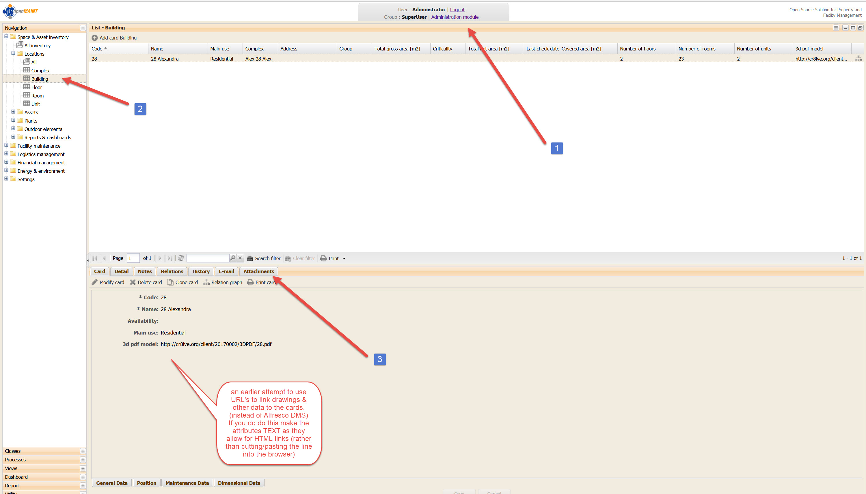 If we jump back to Alfresco, you will see that there is now a Tree with the elements that have attachments shown, I have made attachments for Building, Floor and Unit so far, you can see these three shown below.