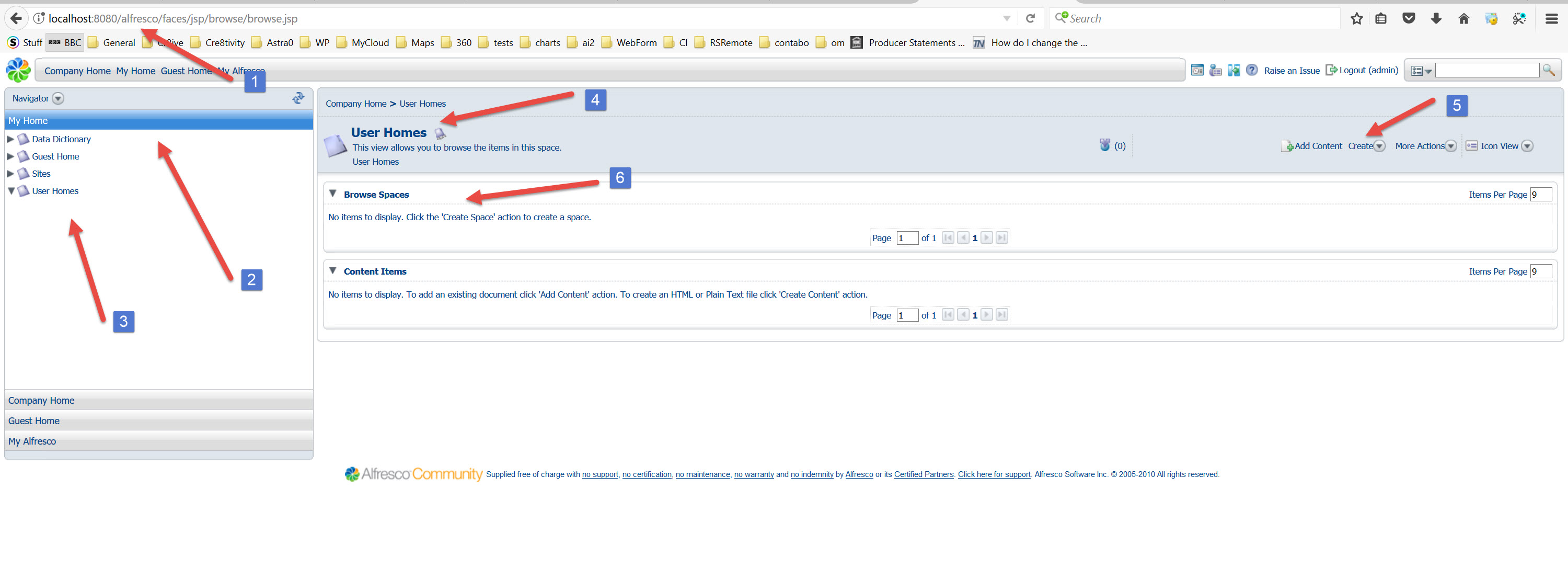 We go into My Home on panel on the left, then User Homes and create space cmdbuild (to mirror what is in openmaint DMS setup above).