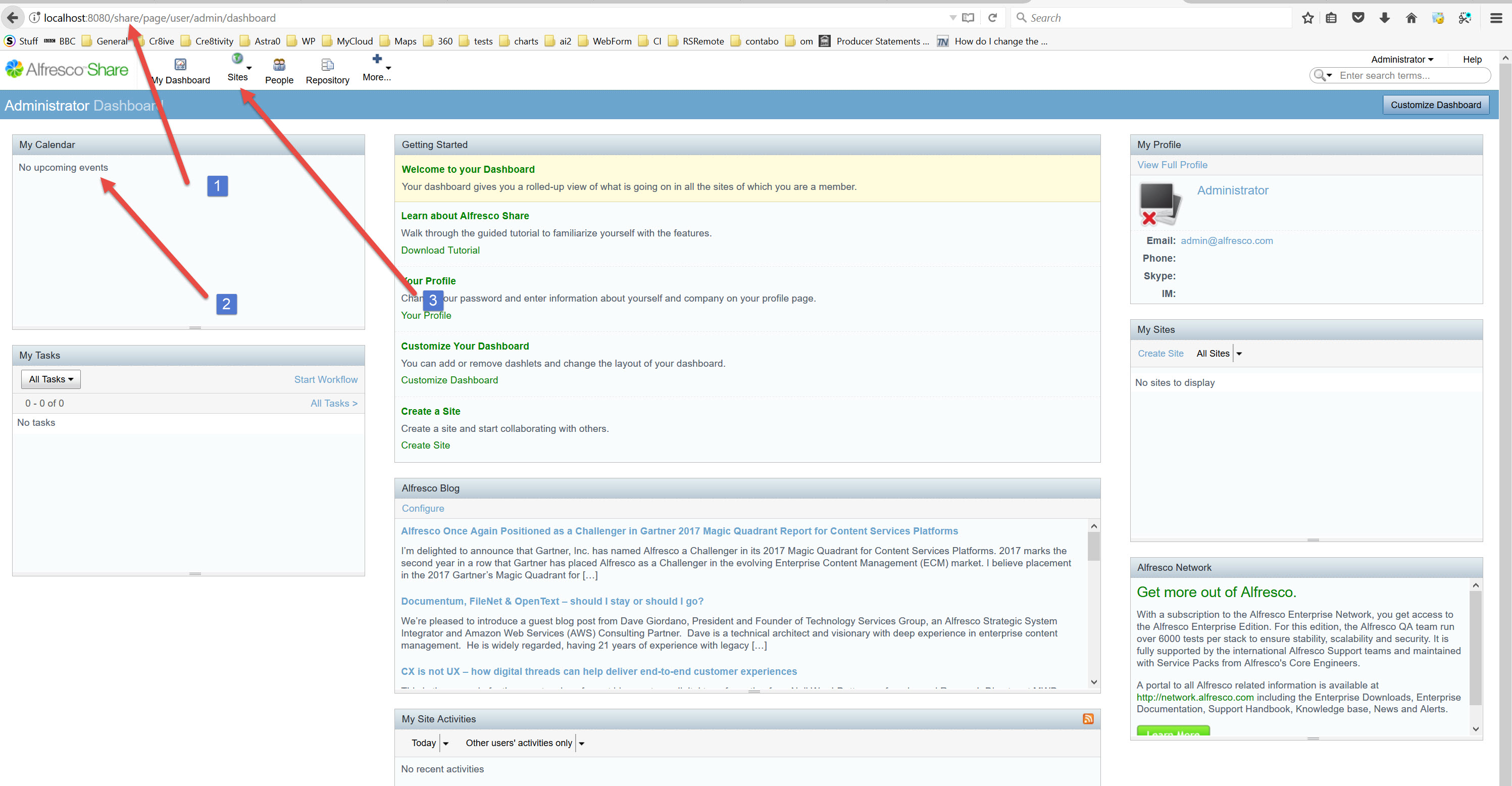 - http://localhost:8080/alfresco- login as Administrator (username : admin, password: admin are default)