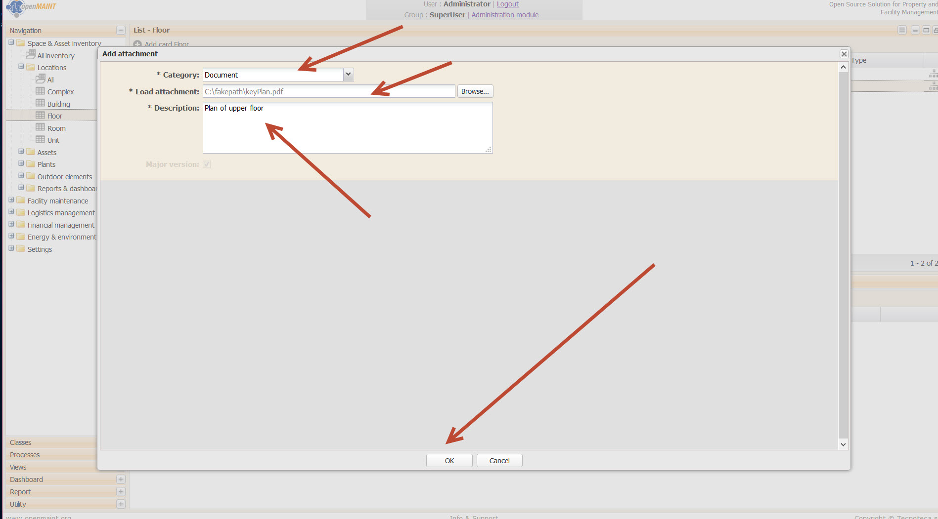 - http://localhost:8080/openmaint – login as Administrator (username : admin, password: admin are default)