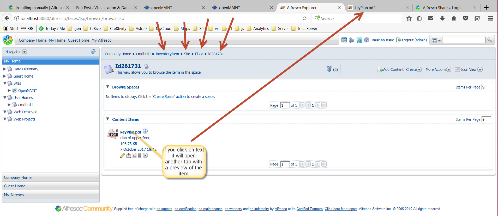 If we click on floor, we will see there is a document t there, and if we click on the filename (keyPlan.pdf) it will open another tab to show a preview from within Alfresco. A point to note. The floor reference in Alfresco is Id261731 , see 3 slides below