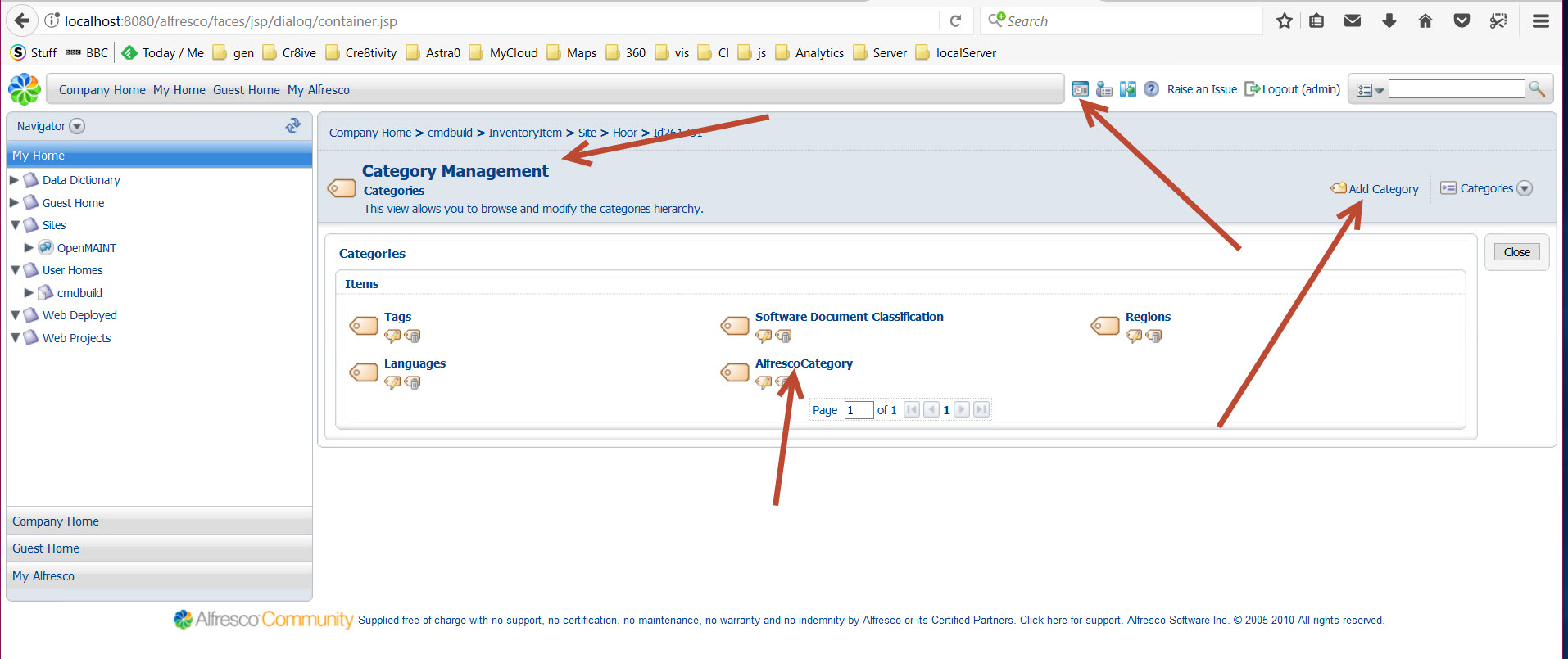 We then go into Administration Console , the little square icon, choose category management and Add category AlfrescoCategory to match openMAINT DMS setup.