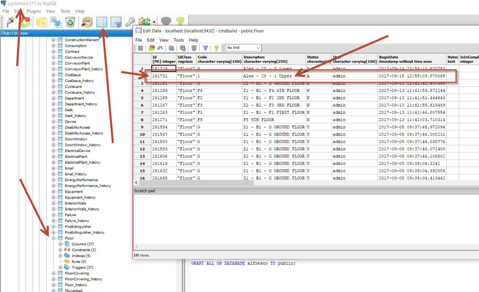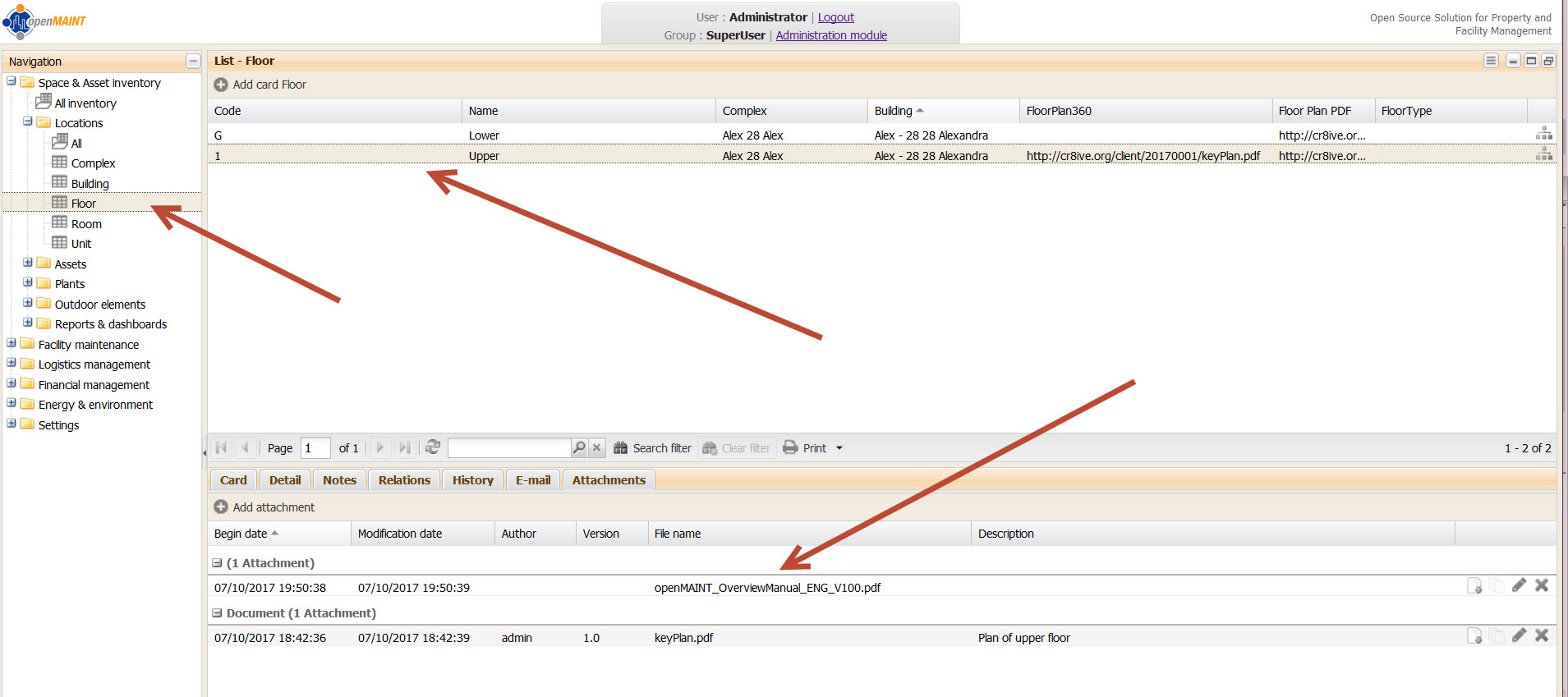 Ok, so the The floor reference in Alfresco is Id261731 is the ID reference in the openMAINT Database Table Floor that refers to the Upper Floor. So that is right, just not very clear. Maybe there can be a better referencing to allow for previewing information in Alfresco.
