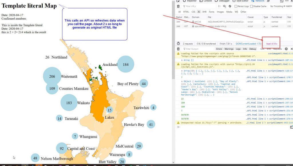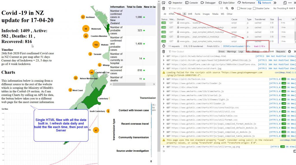 I finally got some of the things working and then I compared load times with the original map and charts below. 1/The first image is the original file that has the data in the file itself, I rebuild it daily with updated data and then put it on my server. It takes 2.18s to load and calls a chart & table from amCharts.js. 2/ The second image is the map from calling API data, downloading it as JSON and processing that and rendering it. It calls 3 api’s for the data then generates the resulting page. There is only the map on the page so far. It takes 4.18s to render, almost 2 x as long as the HTML page.