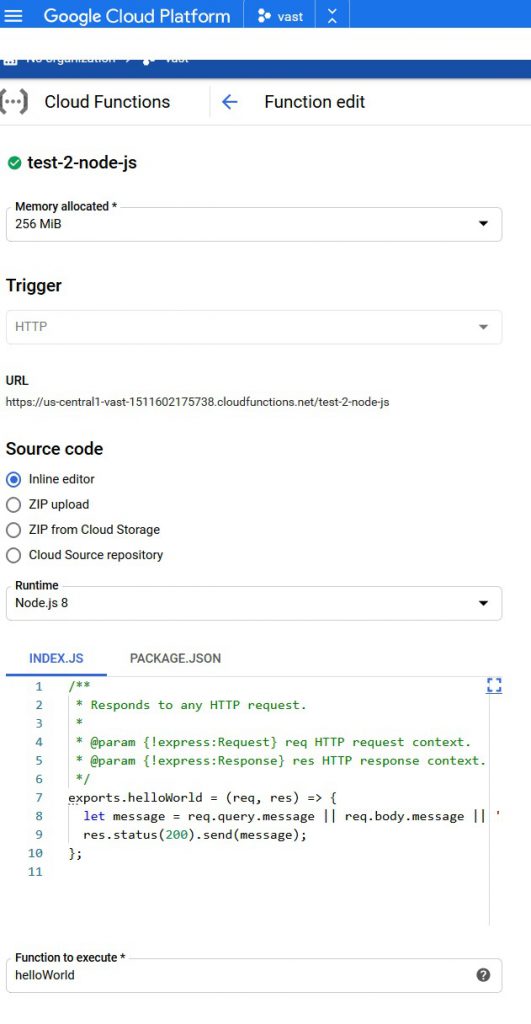 I was watching a node JS vid and saw the chap use GCF and I was keen to give it a crack. I’d set up a Google Cloud account (there are free services but you have to give your credit card details for the account and billing) when I was playing with the data collection app Collect, so used that account to setup a function. I got as far as getting the Hello World test to run on the app but when I tried to run the function from the given URL I got a 403 Forbidden .