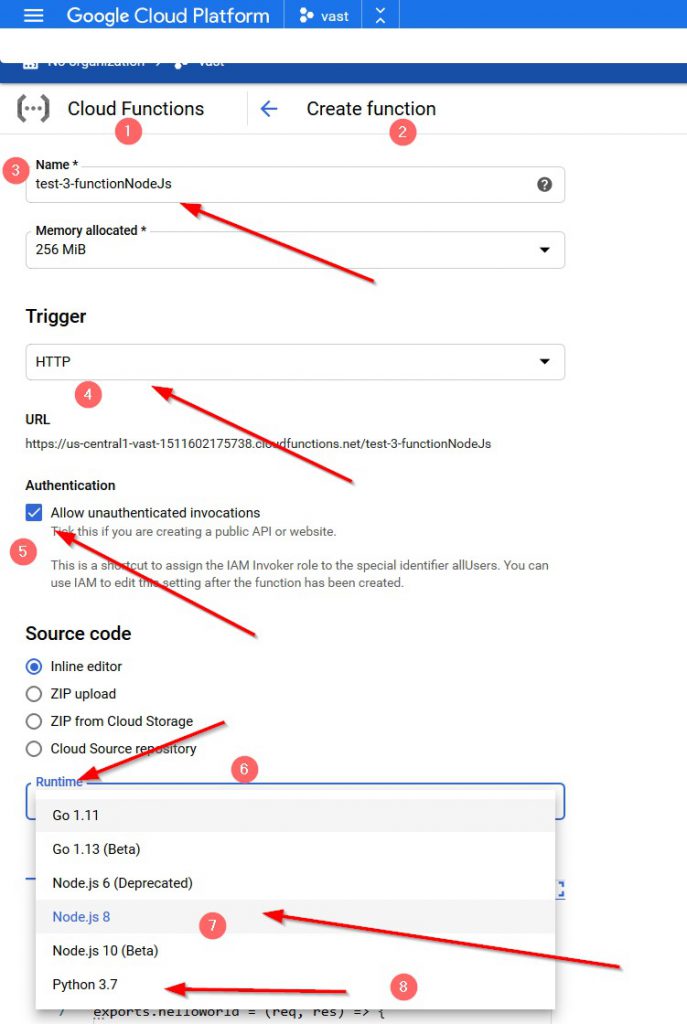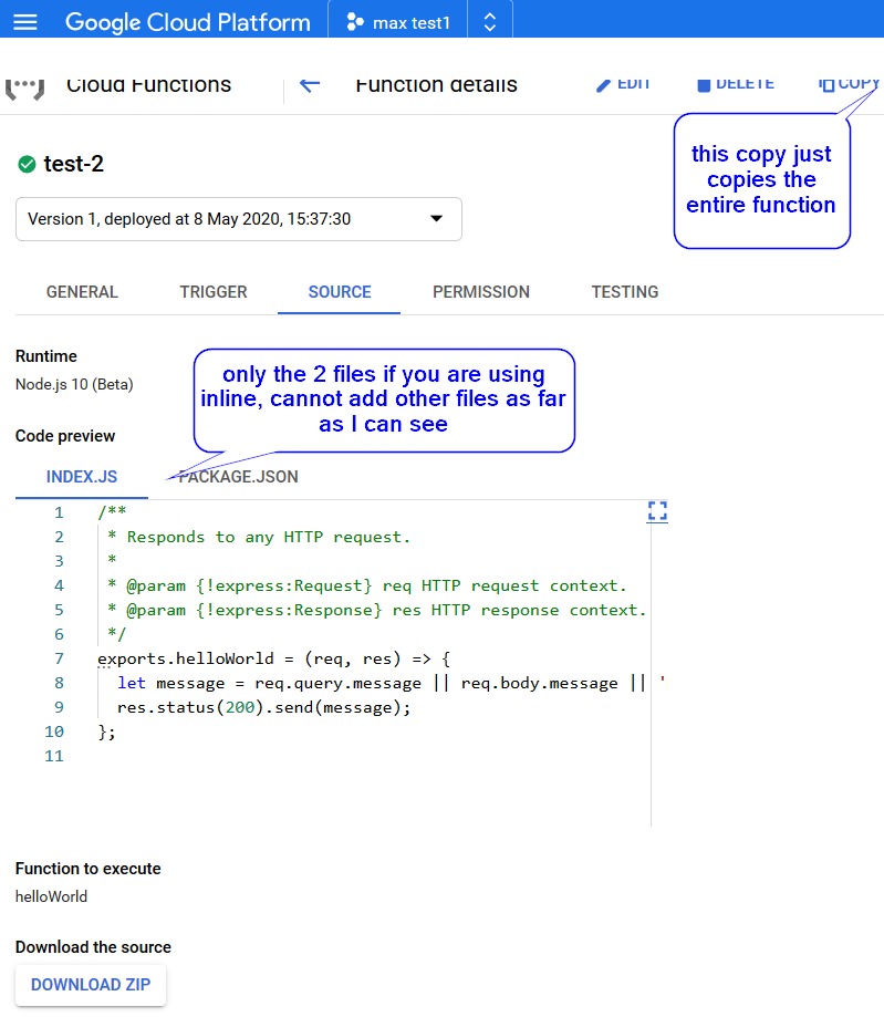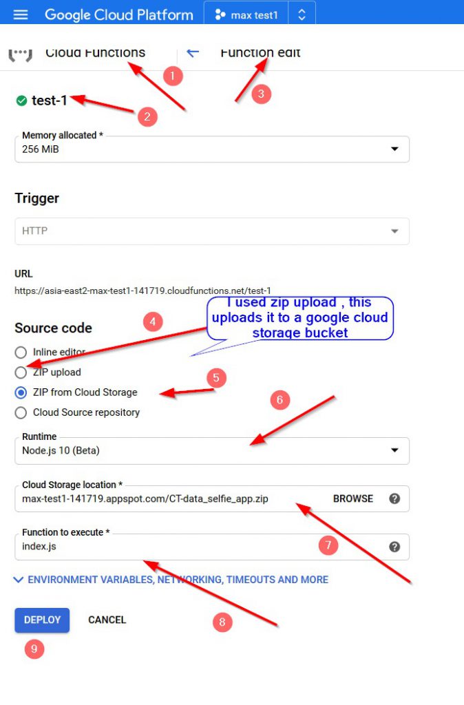 To upload the project I zipped up all the directory and used Zip upload (4 in image above) and it asks you for a cloud storage location. I had a cloud store from another project and used that (7). I poiinted to index.js (8) for the function I wanted to run.