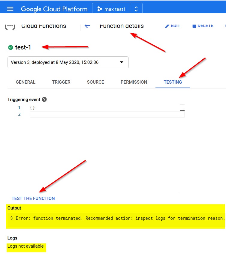I then tried to run the function & just got errors. It tells you you have an error and points to a log that isn’t created.