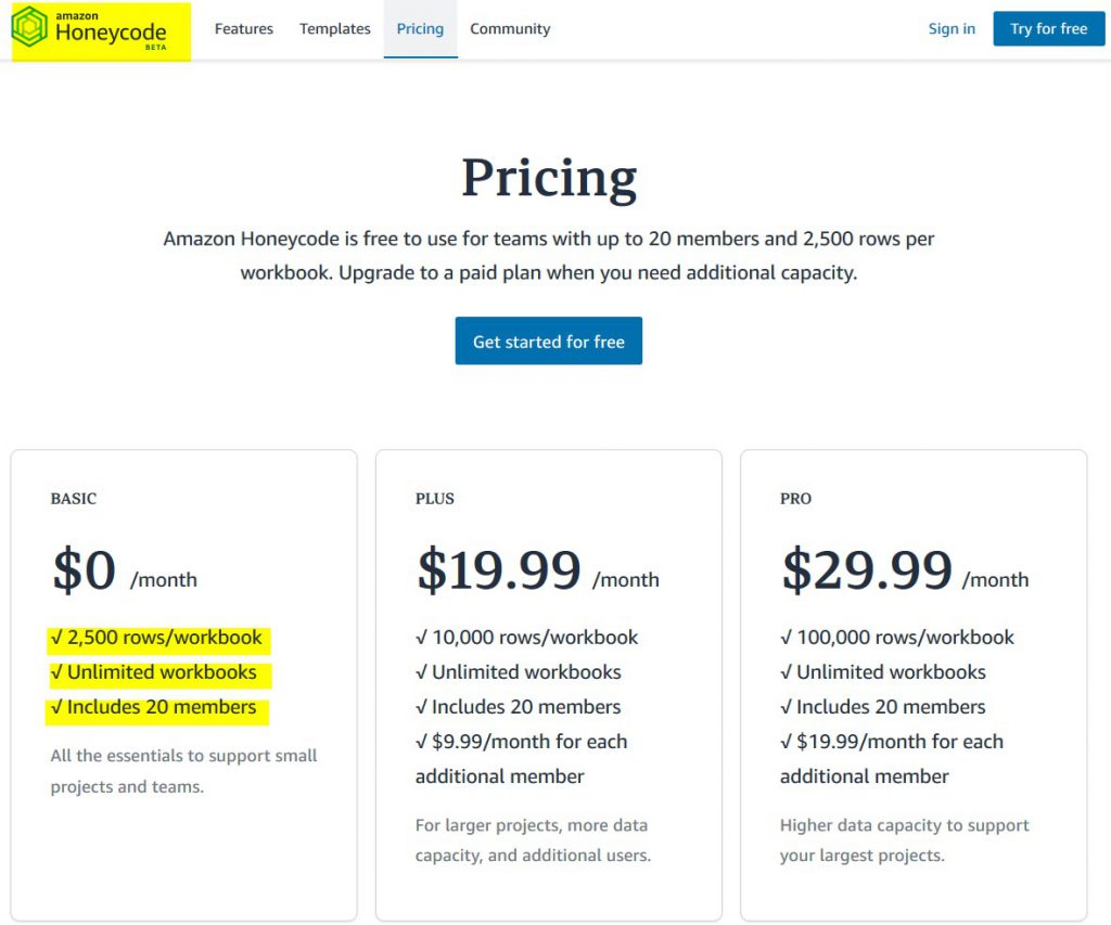 Amazon Web Services(AWS) have just released Honeycode (https://www.honeycode.aws/), to help businesses develop apps without code. It allows you to have 20 people in a team (to share apps) and 2,500 rows of data and as many apps as you want.