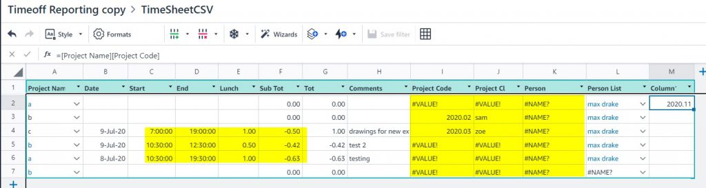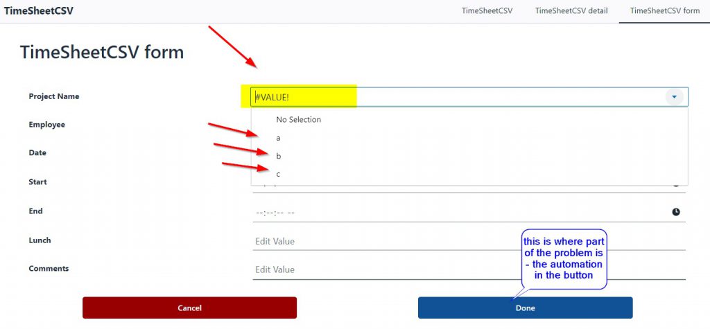 The other issue I had was the Project Name, linked to the Project Table was not showing on the INPUT FORM, even though you could pull down and select different items it still only showed #VALUE as per the images below