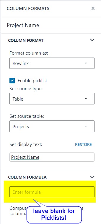 I was trying to put in COLUMN FORMULA for the picklists with the table formatting, and that did not work. You need to leave it blank (I wasted a hell of a lot of timewith that issue)
