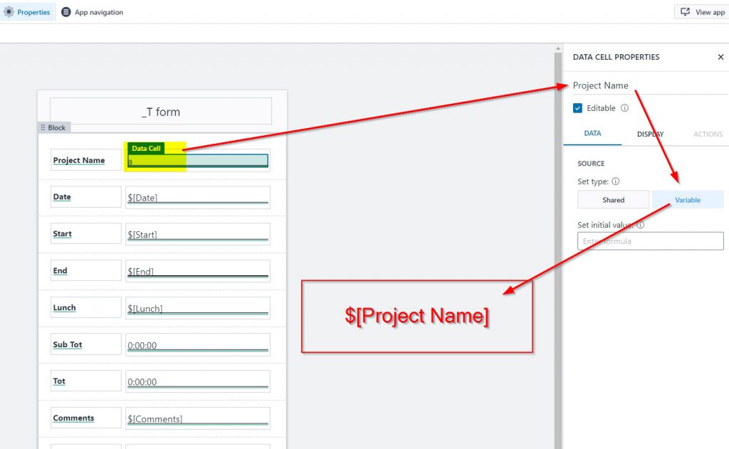 This is the issue that caused my confusion. The Data Cell object is a variable, it has the name Project Name, but to use that Data Cell as a Variable you call it by $[Project Name]. If you use [Project Name] without the $ then you are describing the column in the table instead.