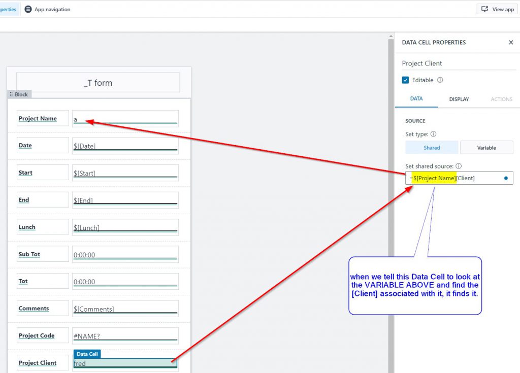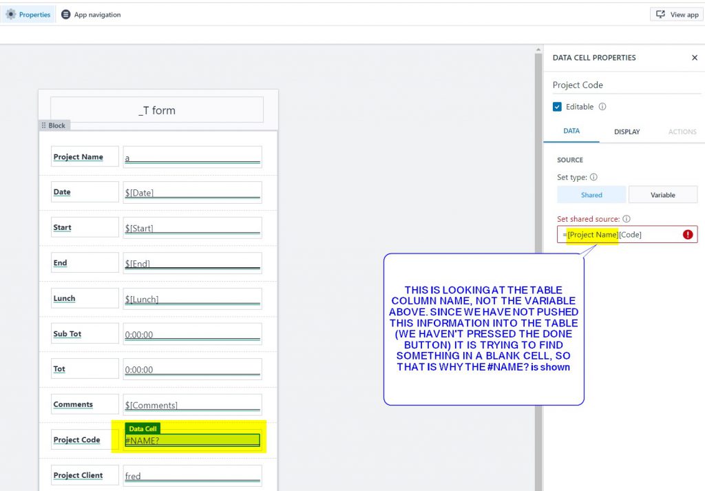 So when you use [Project Name][Code] it is referencing the Table column, not the Data Cell Variable, so of course you’ll get #NAME? as its comparing it with something that has not been created until you push the DONE button and copy the data from the form to the Table.