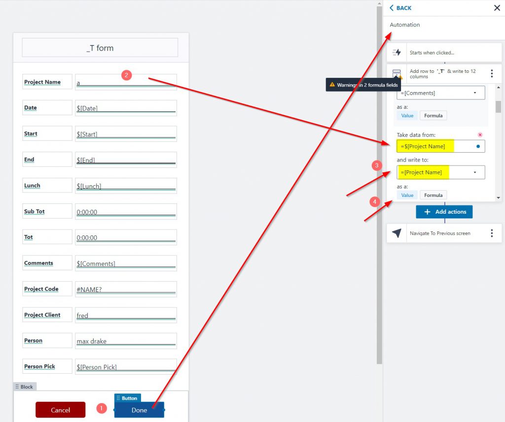 - This has an automation behind it and takes the variables in the Input fields and copies them to the Table column fields.