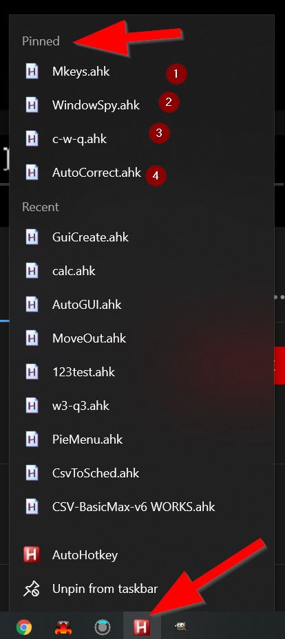 Access. I have AHK pinned to my task bar, clicking on it opens browser to doc page, but right clicking on it allows me to pin some AHK scripts to the top, so they are easy to find to start if I’ve shut them down and want to restart them, I don’t have to go looking to the directory to double click on them.