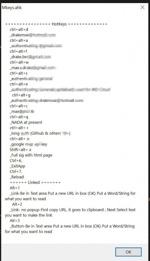 As I’m using #Include in my main AHK script I have added a help button at Ctrl+8 with reference to hotkeys in the main file and also to the linked file, so I can use them whilst only running this one. Handy when you can’t remember Hotkeys. Also just use Ctrl+7 to refresh the file, even if I’m only updating the linked file.