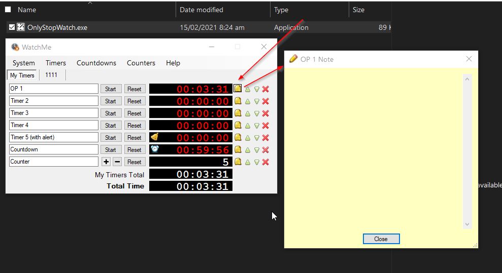 Watch Me (from Freeware Files.com) has multiple timers, and you can add counters, and you can add more of each (or delete some). This allows for one timer, so if you switch tasks the other timer pauses. It has a notepad to add notes to. Its feature rich and I’ve only glanced at it, but I think I’ll need to give this one a spin to see if its better than Hellbent’s one. I lie the idea of multiple timers, you can have several running at the same time, but I quite like the single timer running. The notepad is good, but I think I like the push to a file.