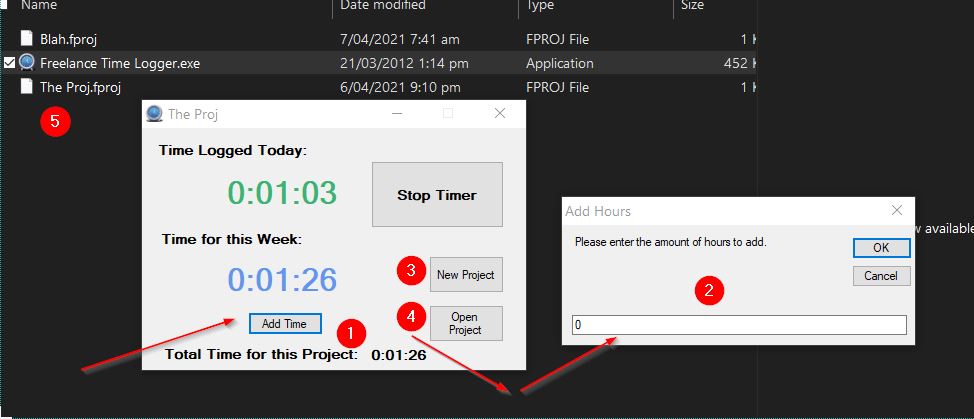 Freelance Timer (from Freeware Files.com) Has a simple interface, allows you to add time, have multiple projects, when you choose Open Project it switches to new project and pauses the other. It has total time for week too, which I haven’t tested, but shows accumulated hours. The storing of the file is to a .fprj file that is a little hard to figure but I suppose you could adjust the raw data. See 2nsd image. It doesn’t take a note though. Straightforward, logs directly to a file, one for each project, and switching projects records to next job. A good way of keeping all project times separately although maybe a nuisance if you are trying to look at overall productivity over all projects together.