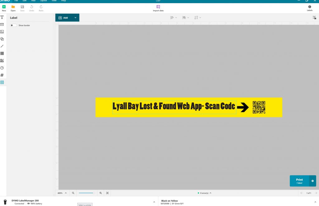 The address was a bit long so I used Bitly to shorten the address, as the label tape is only 12mm wide and there is at least 1mm either side so QR code is a bit small, but it seems to scan OK.