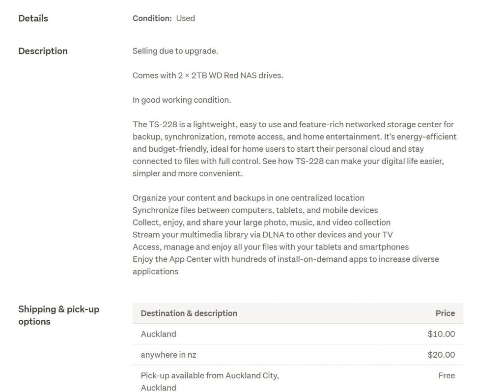 A new NAS in this class is about $320 NZ and the Hard drives are each about $140, so if purchasing from new it would set me back about $600 NZD. I’ve paid $320 for it.