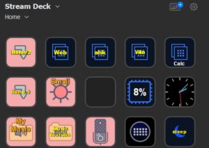 I can get to most popular profiles (Web at this point) and also have some info on Time & CPU usage (from CPU plugin) and bottom right link to Stream Deck program so I can add a button quickly if I have an idea for one.