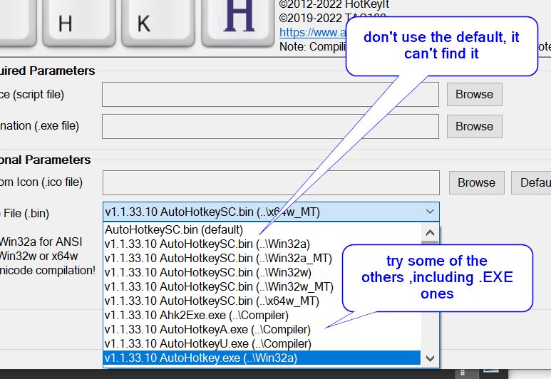 - Compiling- from video above it looks like you can use the AutoHotKey _H for better compiling, but I get, on my Surface Pro issues with Antivirus program trying to delete my .BIN files , also need to choose specific bin file and not use default. See first image below. I did have this issue later when I was using freeFileSync, the AutoHotKey _H folder seems to have a virus in it, so I’ve deleted it.