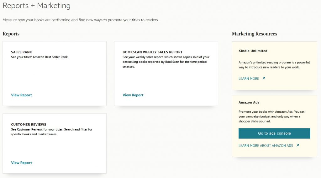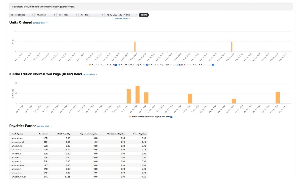 I think they hold for a month before they pay you, so you don’t see anything for a couple of months. Another wait and see, although I did see an item on the authors page, Reports & Marketing , where you can review down to weekly sales for granularity. As book has not been up a week there is no data yet (only Wednesday and I posted Friday last week).