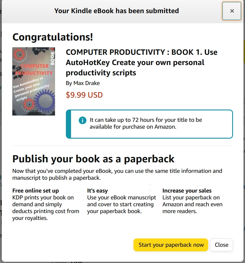I was watching a video on Low Content books (https://www.youtube.com/watch?v=MPOisaqcYmQ) and it skipped onto the next video that showed marketing and when I typed in AutoHotKey there were minimal results so I’ve re titled the book and changed the cover to match the update. So re-submitted with new Title , now have to wait for it to be approved and published. I also added stuff to intro/description, hopefully that will help too.