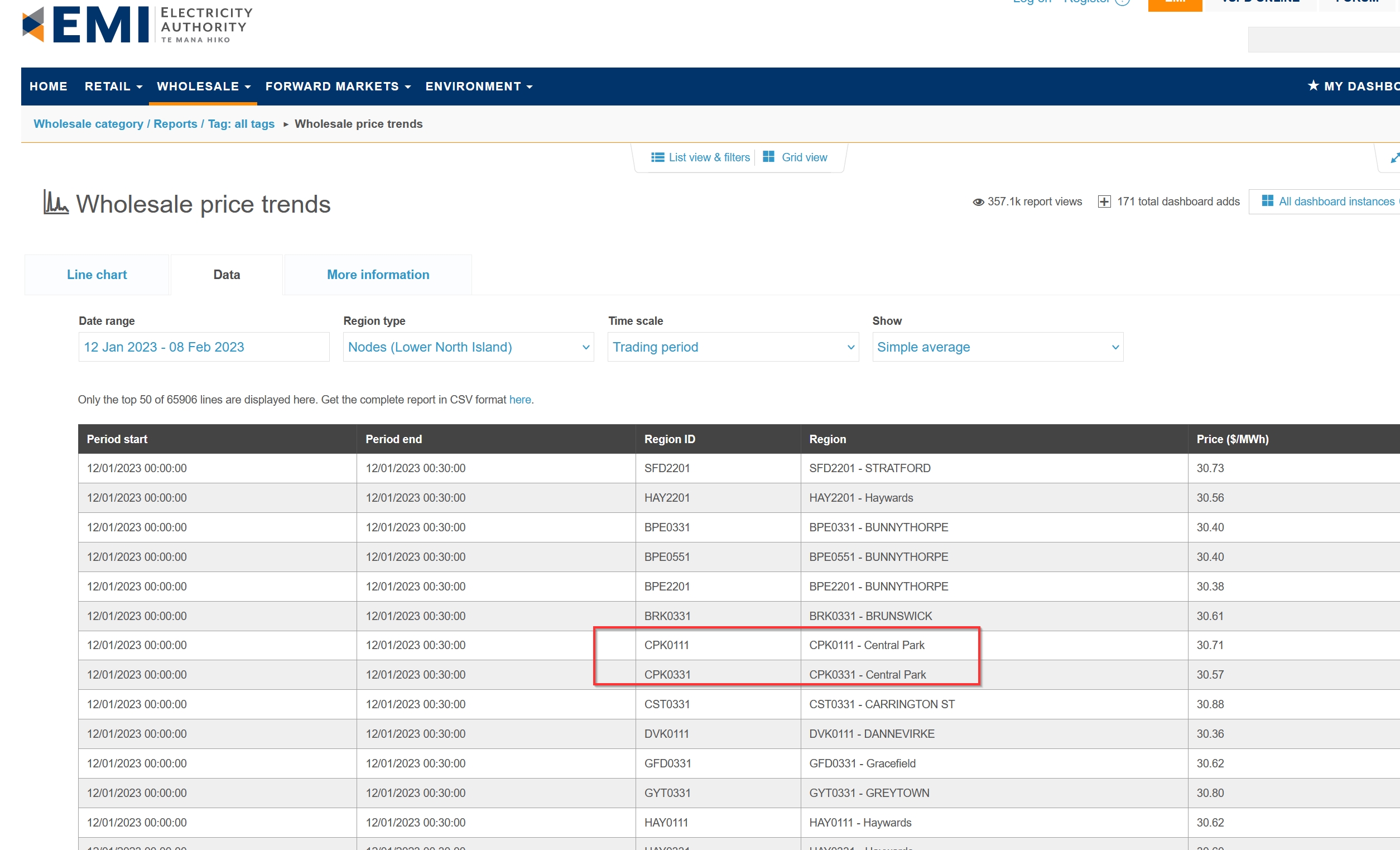 I then took that dataset and filtered it down to the 2 local substations in Wellington , Central Park 111 and 331. I used Excel filter to filter the relevant substations into 2 separate CSV files so that I could upload them to Pandas Dataframe for analysis.