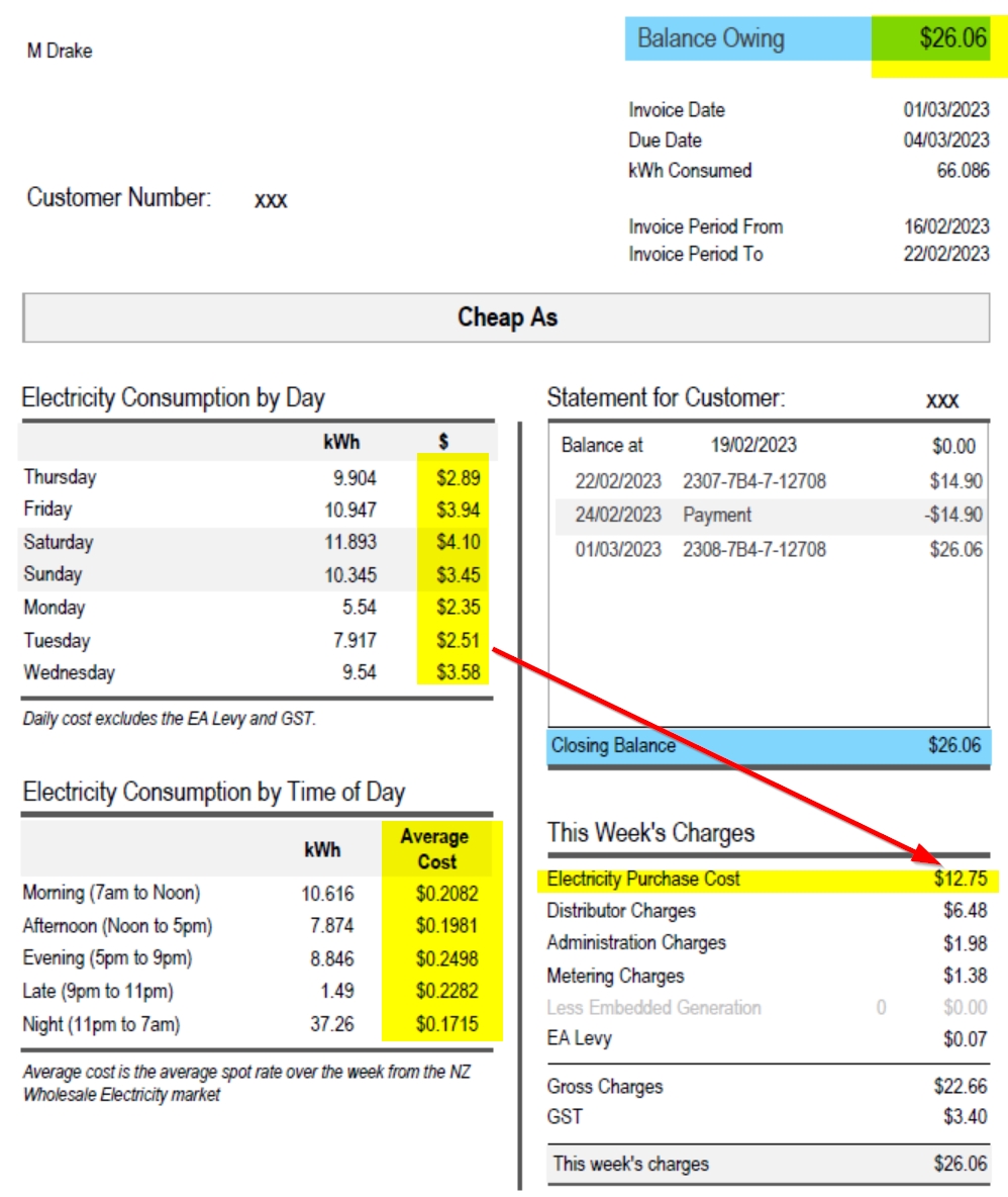 The actual Electricity purchase cost is usually just over 1/2 the actual bill, there are other charges such as “Distributor charges” that have a fixed component (minimum charge) and proportional component (based on kWH used) that is added to the bill for the final charge. So for the bill above the actual kWh charged is $12.75 and the total invoice is for $26.06