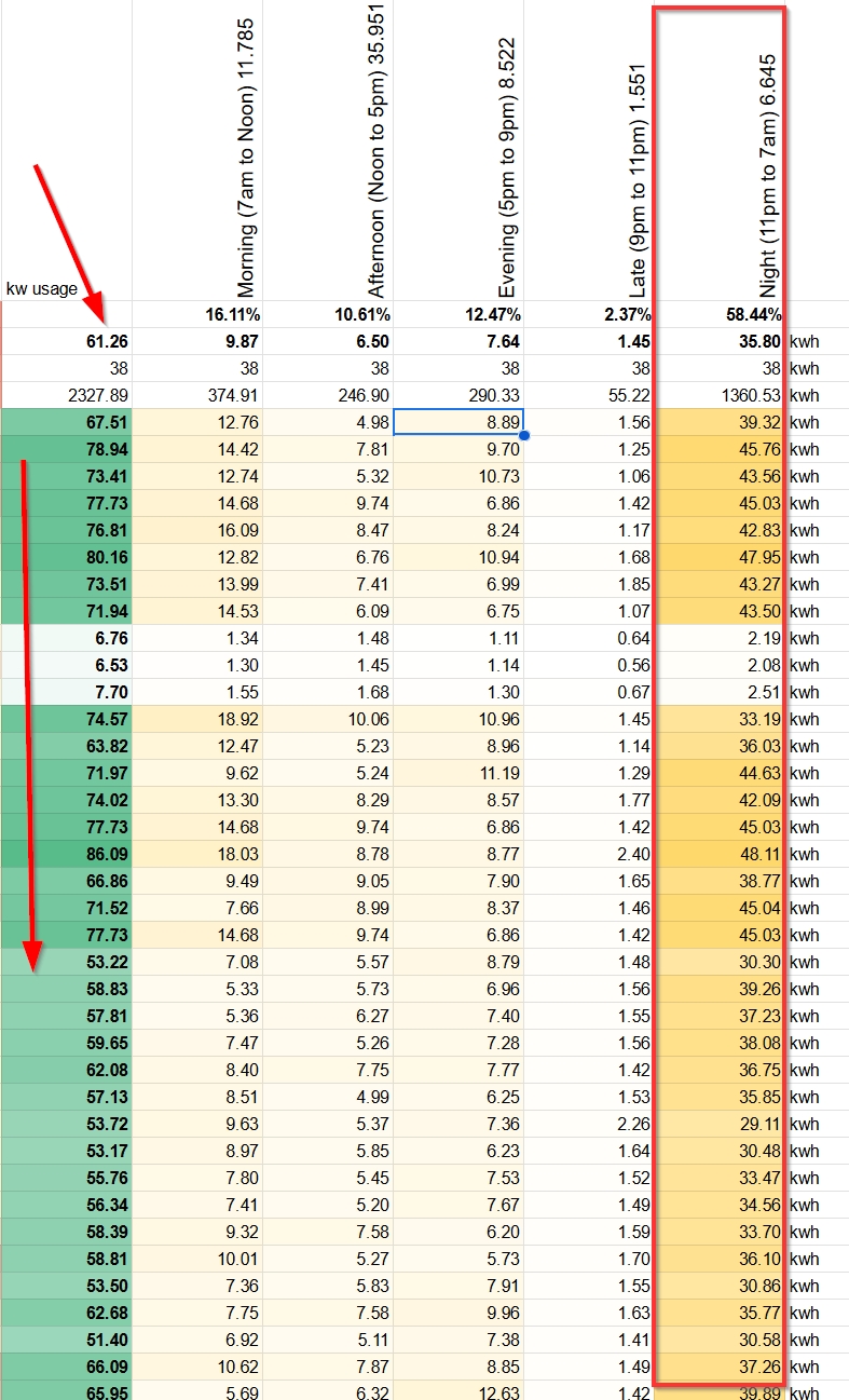 As there are variable charges based on time of day I realised that I would get more kWh if I could shift more of my usage to night time where the cost/kWh is mainly less than during the day.