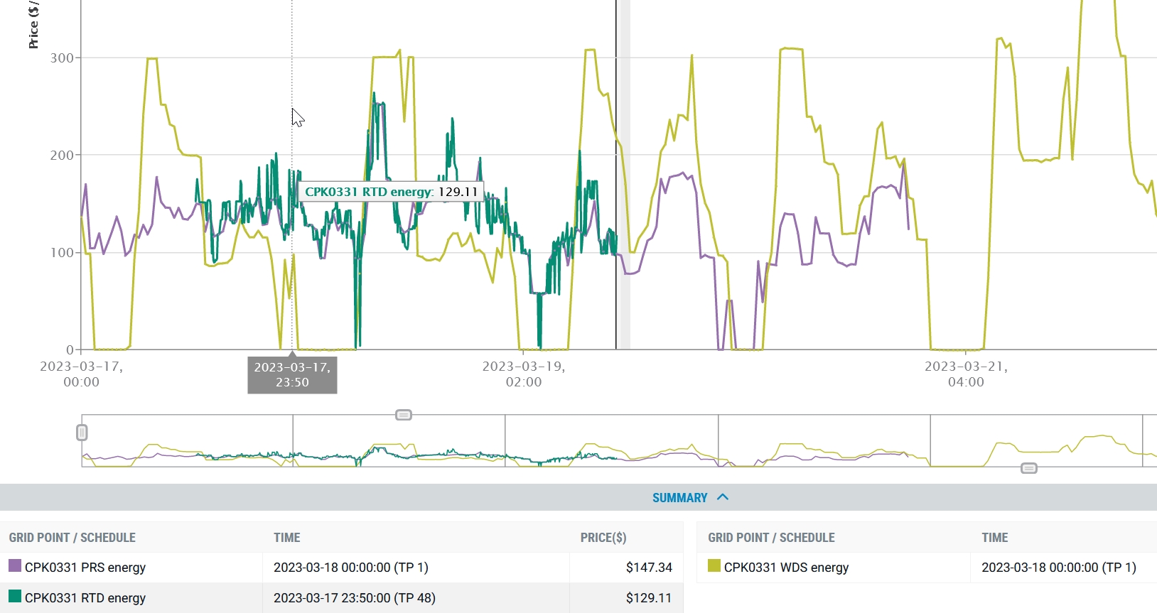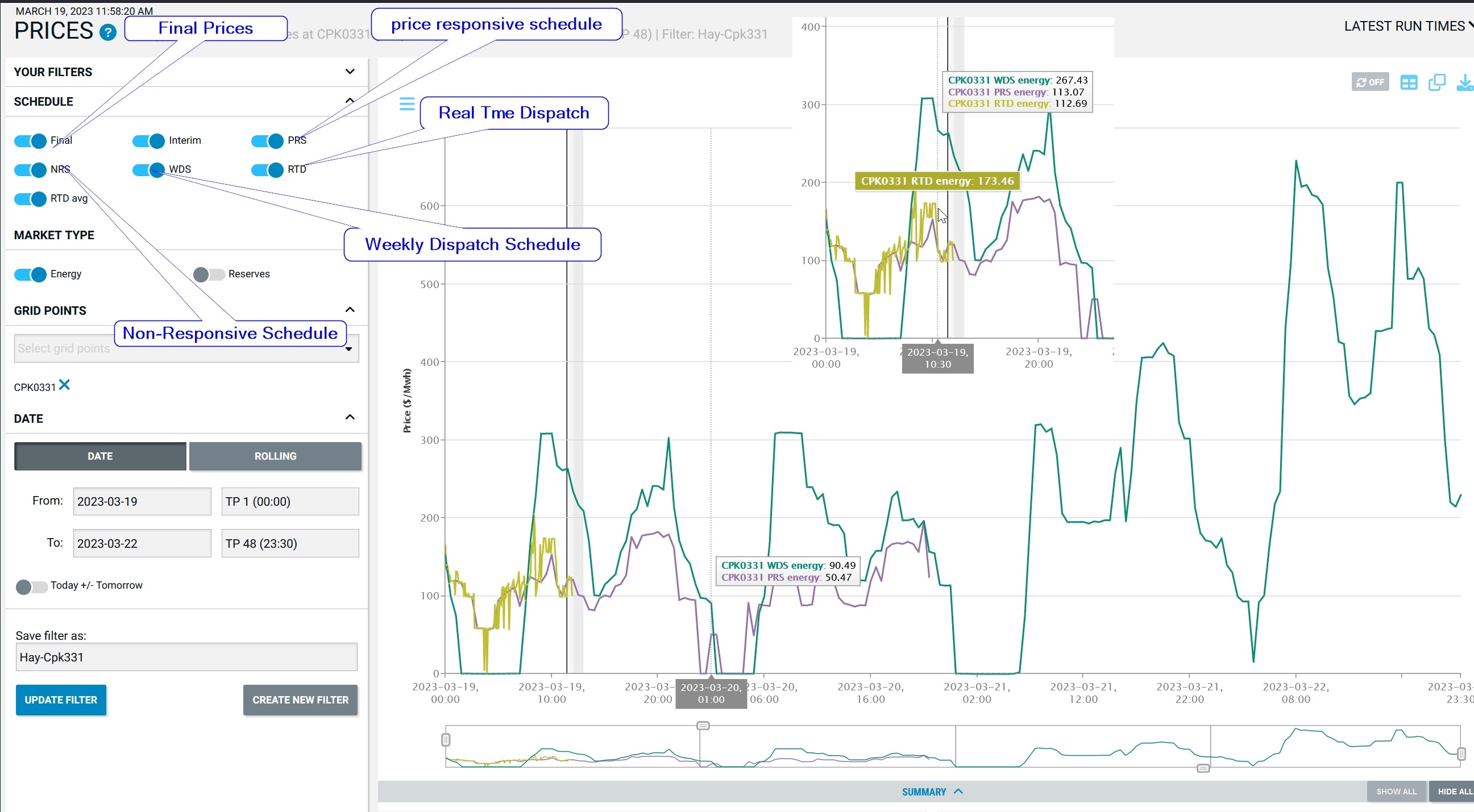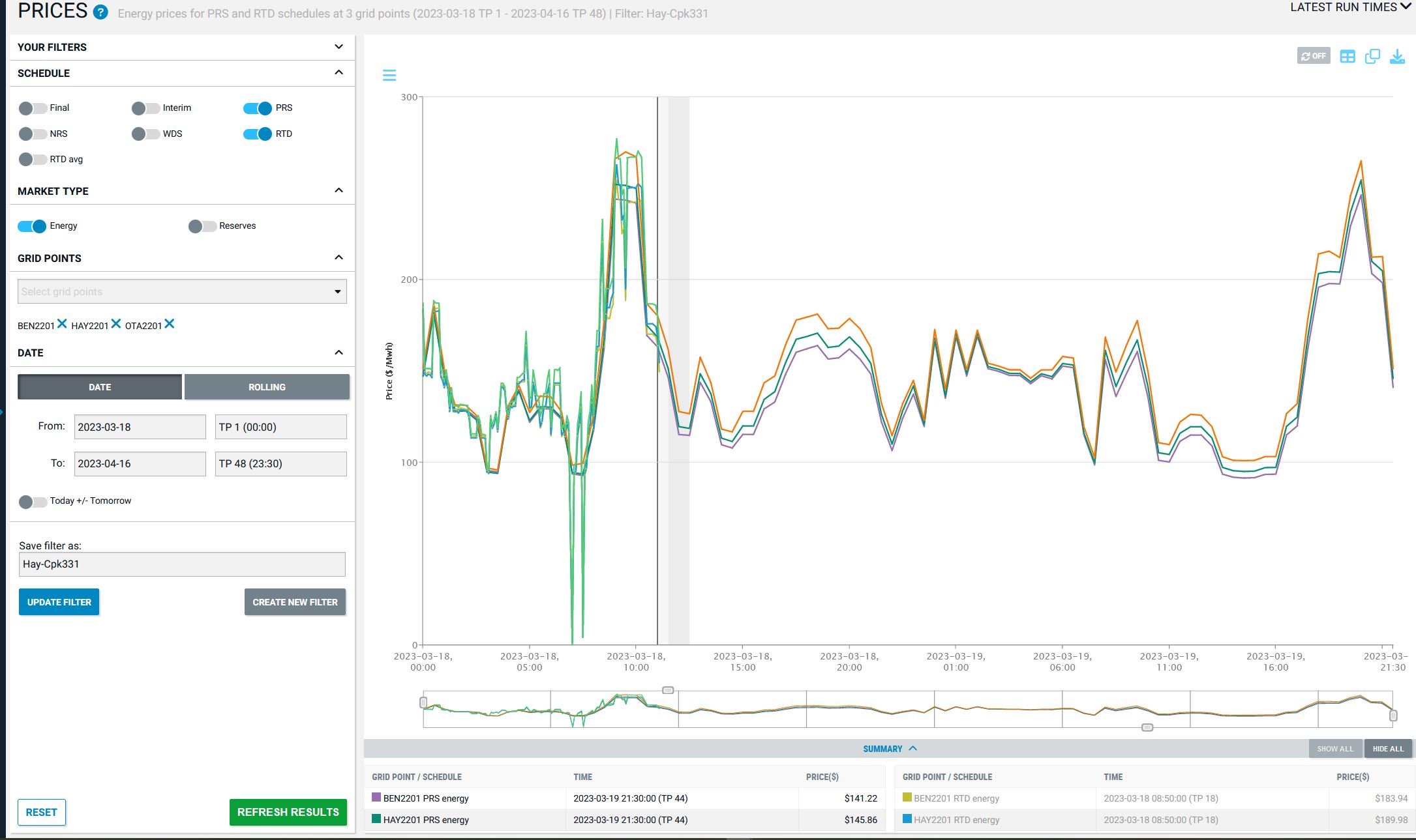 Pricing information can be filtered in a variety of different ways. The minimum required parameters to filter data are a list of one or more schedules (market run types) and the market type being queried (either E for energy prices or R for reserve prices).